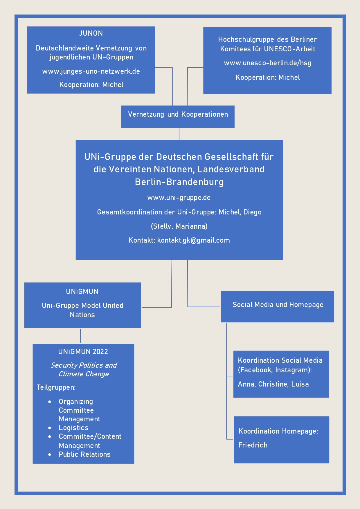 The entire UNi-Group is overseen by a group coordinator (GC) who have the primary responsibility to keep the structure intact and running. Content oriented work of the UNi-Group is primarily done within the four project groups that are managed by project coordinators (PC). All members gather at all-group meetings in order to discuss organisational matters, to organise projects and to distribute manpower. Within the specific project meetings which can take place additionally to the all-group-meetings, members will realise their particular project. The GC and/or up to two Coaches attend to members and supervise the PCs; they practise with the members among other things management and organising or give chairtraining so that newcomers can take over the responsibibilities of the chairs during UN-simulations.